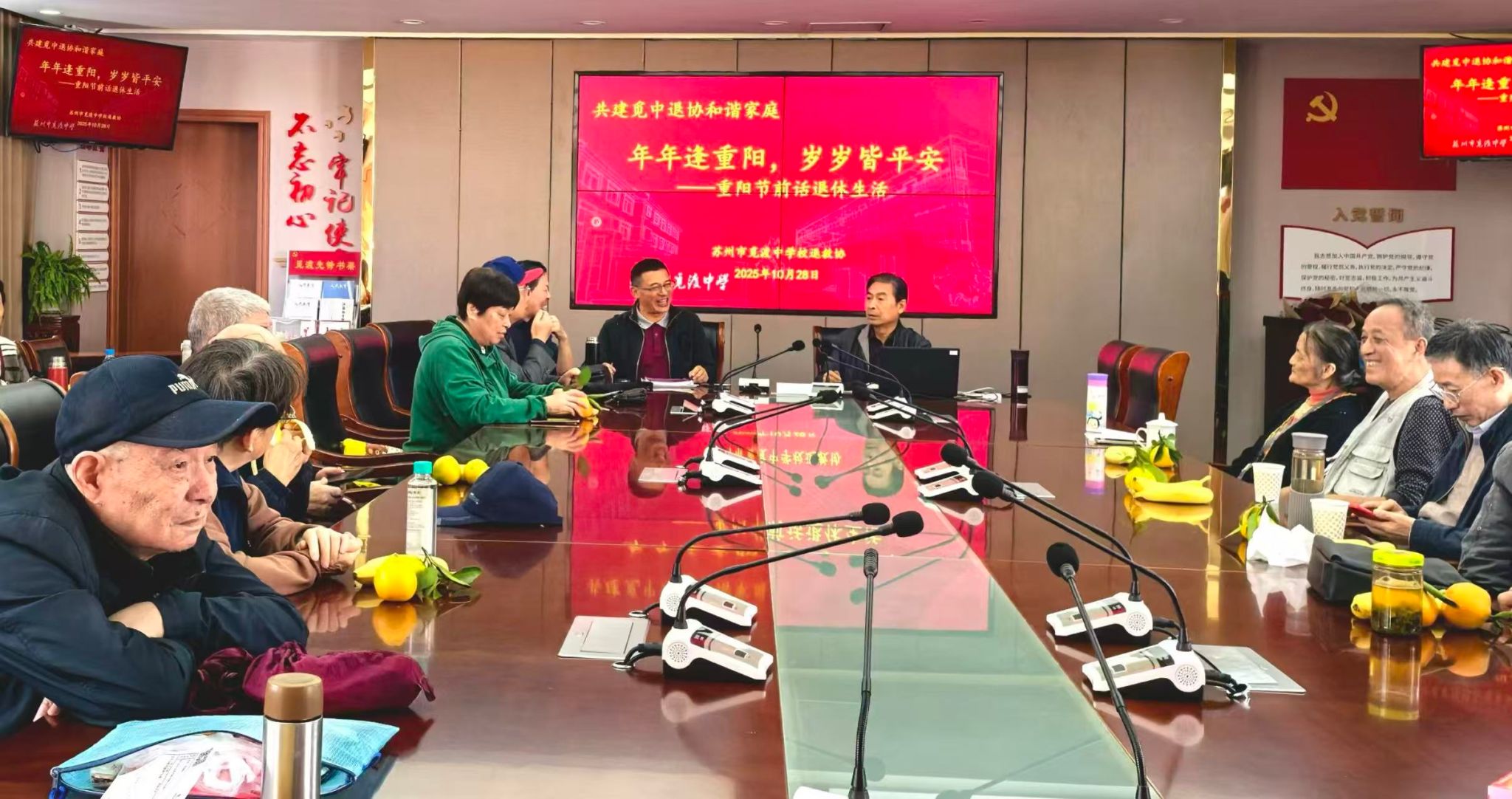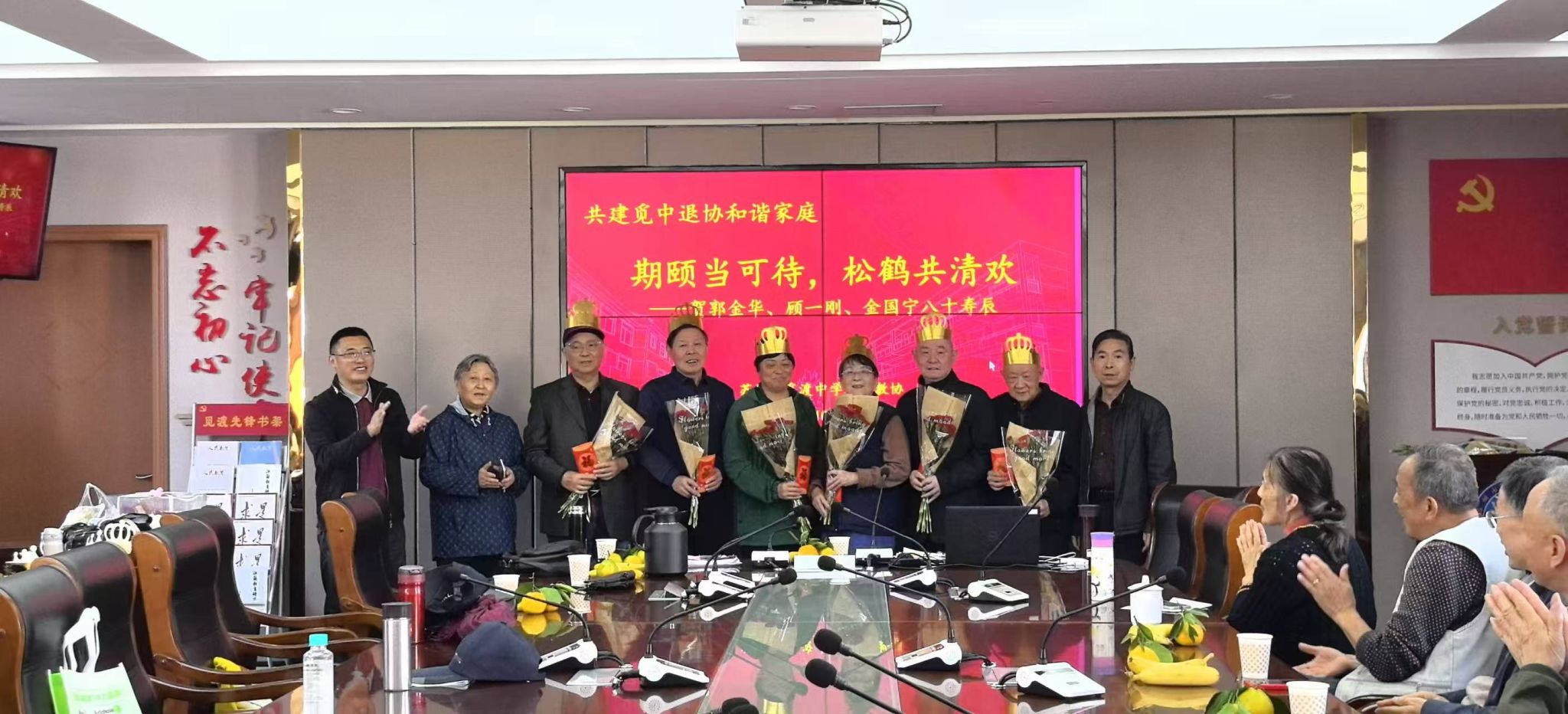 金风送爽,丹桂飘香,九九重阳携暖而至。10月28日下午,觅渡中学会议室内座无虚席,红色底色的PPT上,“年年逢重阳,岁岁皆平安——重阳节前话退休生活”“期颐当可待,松鹤共清欢——贺郭金华、顾一刚、金国宁八十寿辰”“生命之树常绿,生命之水长流——贺蒋志健、俞建初、薛亚明、陈桂英七十寿辰”的字样格外醒目,一派喜庆祥和的氛围萦绕全场。由校退协主办的重阳节庆祝暨七位寿星祝寿活动在此温馨启幕。