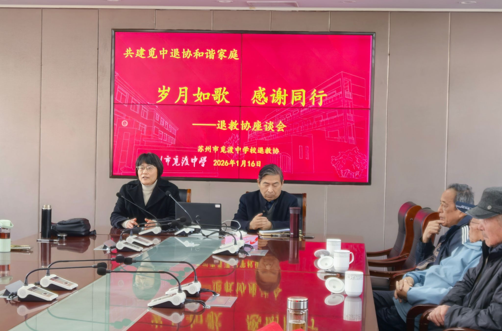 冬阳暖照,情谊绵长。2026年1月16日下午,觅渡中学二楼会议室暖意融融、座无虚席,红色背景的PPT上“岁月如歌,感谢同行——退教协座谈会”主题格外醒目,尽显祥和温馨。全体退休教师欢聚一堂,共话往昔岁月、共叙教育情怀,宋苏烨校长全程参与本次辞旧迎新座谈会,与老教师们共度美好时光。